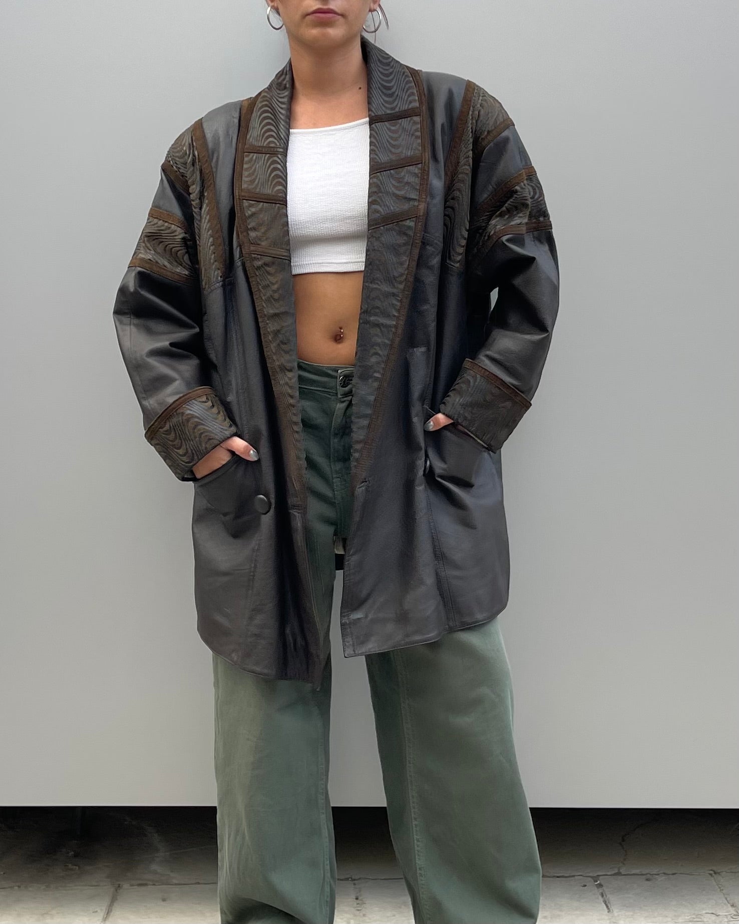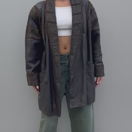 Oversized fit with brown patterned panels and satin printed lining, buttons, shoulder pads and side pockets